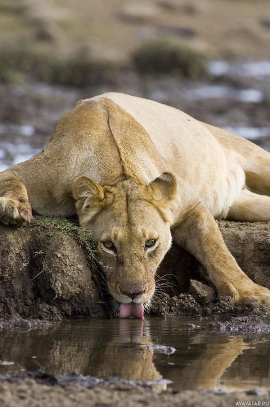 На картинке изображен лев, покоящийся лапой на земле, а его голова опущена, чтобы пить воду из бассейна. Похоже, что он находится в естественной среде, возможно, в саванне или на пастбищах.