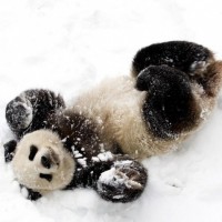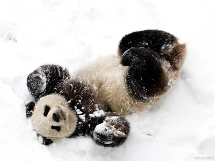 На снимке видна панда, лежащая на спине в снегу. Он, кажется, катится и наслаждается собой, с его передними лапами, вытянутыми в воздухе. Это очаровательная сцена, часто связанная с игривыми животными, развлекающимися в неожиданных условиях.