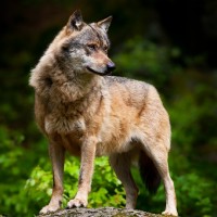 The image shows a wolf standing on a rocky surface. It appears to be in its natural habitat, possibly atop a hill or mountain with trees and vegetation around it. The wolf is looking towards the camera, giving an impression of alertness or attentiveness.