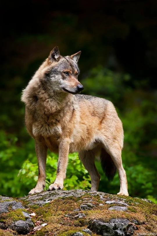 На снимке изображен волк, стоящий на скалистой поверхности. Он находится в естественной среде обитания, возможно, на вершине холма или горы с деревьями и растительностью вокруг него. Волк смотрит в сторону камеры, создавая впечатление бдительности или внимательности.