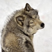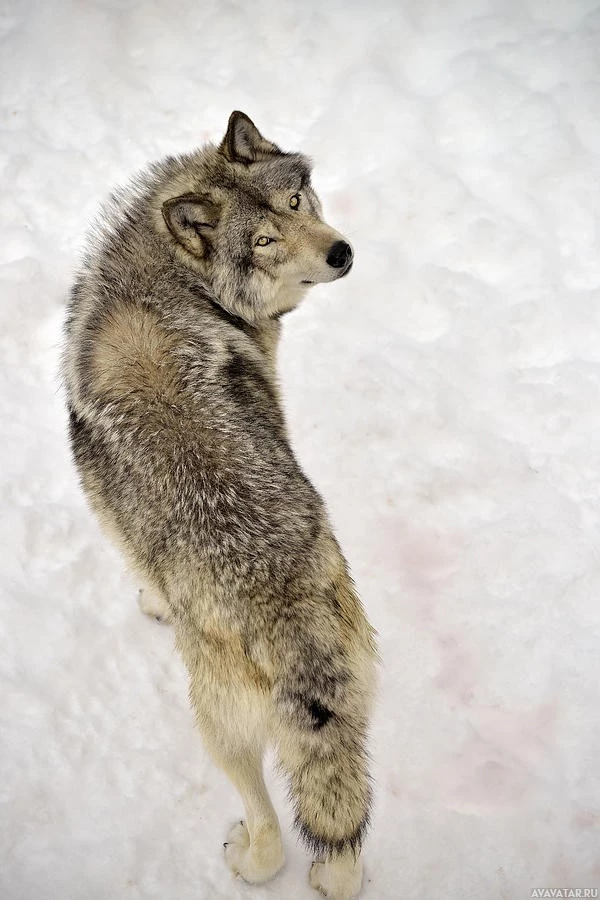 The image shows a wolf standing on what appears to be snow or ice. The animal has fur that is primarily gray with some darker markings, which are