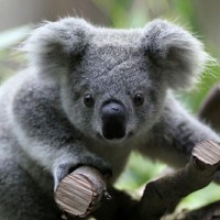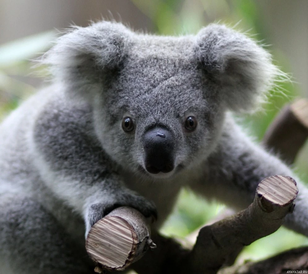 На снимке изображен медведь коала. Он известен своими отличительными особенностями, такими как серый мех, большие уши и заметные черные отметины вокруг глаз, носа и конечностей. Коалы родом из Австралии и обычно встречаются в эвкалиптовых лесах.