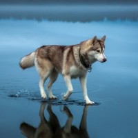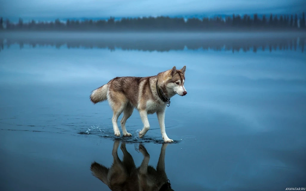 The picture shows a dog walking on the water, possibly ice or