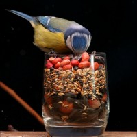 The image shows a bird, specifically what appears to be a titmouse, perched at the top of a glass container filled with birdseed. The bird seems to be eating or pecking at the seeds through the opening of the container.