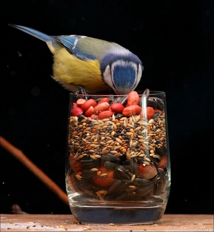 На картинке изображена птица, в частности, то, что кажется сиськой, расположенной в верхней части стеклянного контейнера, заполненного птичьим кормом. Птица, кажется, ест или клюет семена через отверстие контейнера.