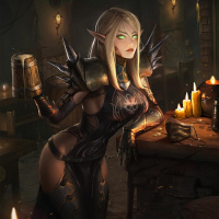 tavern setting. The character's expression is confident, with a hint of defiance in her gaze, which adds to the overall fantasy theme of the illustration. The background includes elements like candles and what appears to be a worn wooden table, further enhancing the rustic ambiance typical of such settings in