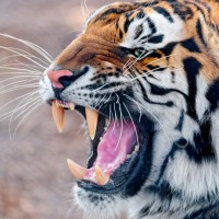 distinctive markings and powerful roar. In the picture, the tiger's mouth is open in mid-roar, and it appears to be displaying