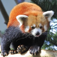 a red panda, an animal known for its distinctive fur pattern with alternating red and black coloration. It appears to be on top of a branch or tree trunk, possibly in