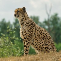На картинке изображен гепард, стоящий на сухом травяном поле с деревьями на заднем плане. По-видимому, это естественная среда, возможно, в дикой природе или в заповеднике. Гепард смотрит на что-то вне камеры, и его отличительная пятнистая шерсть хорошо видна.