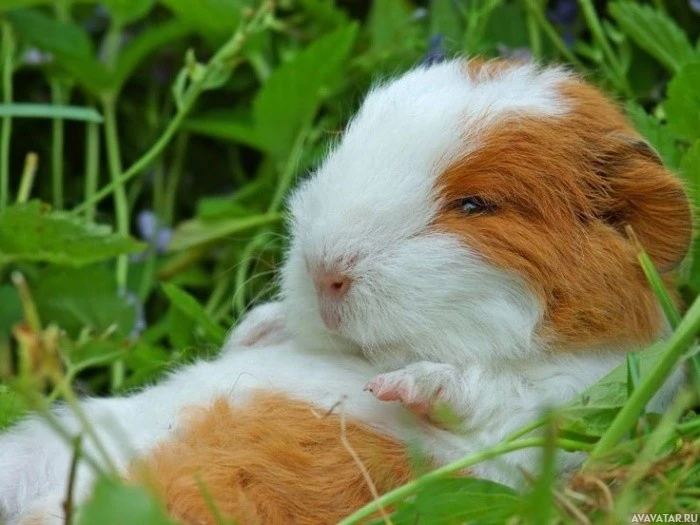 На снимке изображена морская свинка, лежащая на траве. Кажется, что он удобно отдыхает с конечностями, свернувшимися к телу, и у него расслабленное выражение лица. Гвинейские свиньи часто считаются милыми животными из-за их небольшого размера, больших глаз и мягкого меха.