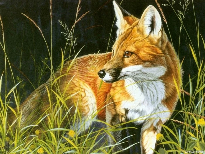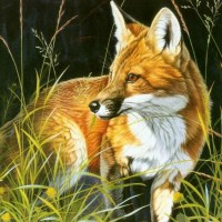 natural habitat. The fox is depicted with its head turned towards the viewer, and it appears to be standing still among