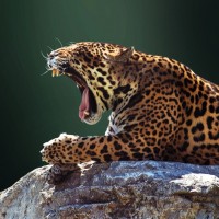 a rock formation and has its mouth open in a roaring position. The animal's