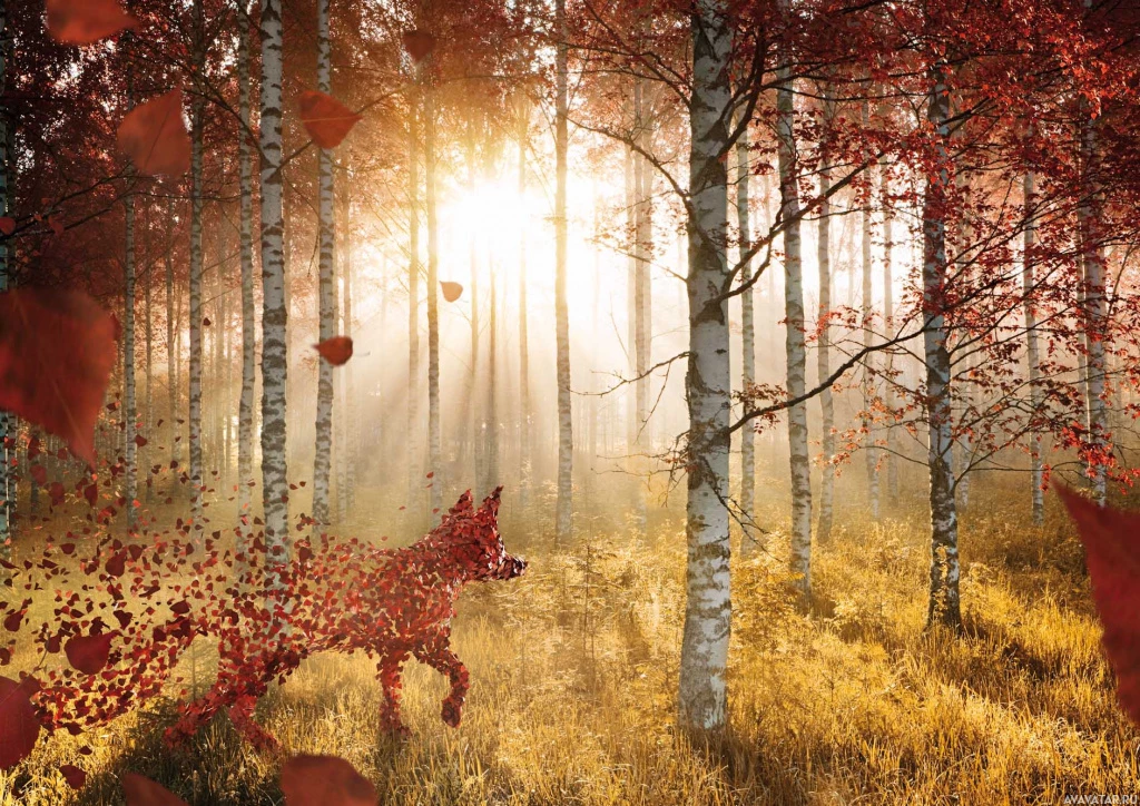 presence of fox in this image could be misleading, as it may refer to the wolf in some contexts or it might simply be an error. The overall atmosphere is serene and picturesque, capturing