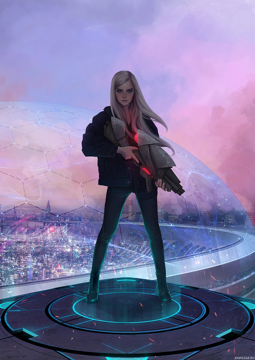 female character with blonde hair, standing on a platform that appears to be floating or levitating. She is holding what looks like a futuristic or sci-fi weapon in her right hand. Surrounding the platform are holographic displays showing various elements such as buildings and digital graphics, suggesting a high-