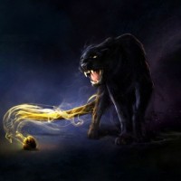 light source, and there appears to be smoke or a magical effect emanating from the panther's paws, suggesting that it might be performing some kind of magic. The overall atmosphere is mysterious and somewhat ominous, with