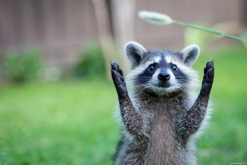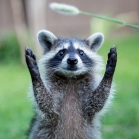 outdoor setting. This picture is often associated with the "raccoon with hands up" meme which features an image of a raccoon with its paws raised in a similar pose.