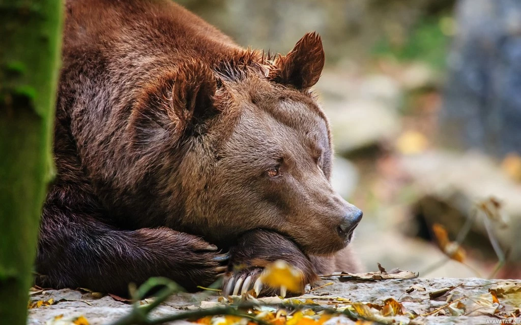 На картине изображен большой бурый медведь со светлым мехом. Медведь держит голову на одной лапе и, кажется, спит или находится в расслабленном состоянии. Расположение выглядит как лесная среда, с видимым подстилкой листьев и, возможно, скалами или деревьями на заднем плане.