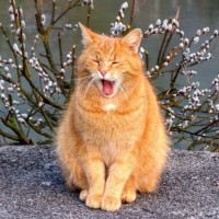 На картинке изображена кошка, сидящая на куче камней или бетона. Кошка смотрит прямо в камеру и открывает рот, как будто мяукает или зевает. На заднем плане есть цветущие деревья, предполагая, что это может быть весна. Небо пасмурное с серыми облаками, что добавляет безмятежной атмосфере сцены.