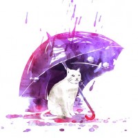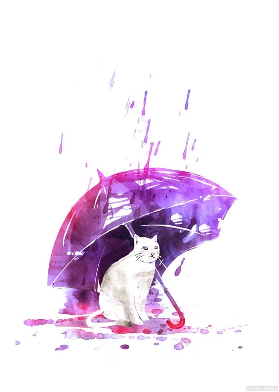 На снимке изображен кот, сидящий под фиолетовым зонтиком. Кошка, кажется, отдыхает или, возможно, укрывается от чего-то, о чем свидетельствуют капли дождя, падающие вокруг нее. Художественный стиль причудливый и красочный, с акцентом на игривое взаимодействие между кошкой и зонтиком.
