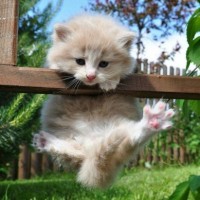 fluffy kitten with light-colored fur. It is climbing up what appears to be a wooden structure or fence in