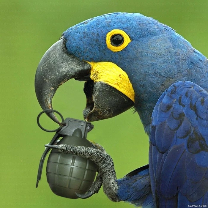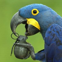 a blue parrot, likely an African Grey, holding a grenade in its beak. It appears as if the bird is playfully or mischievously interacting with the weapon, which is typically associated with destruction and violence. This image could be used to raise awareness about the dangers of unsecured weapons or to highlight the contrast between