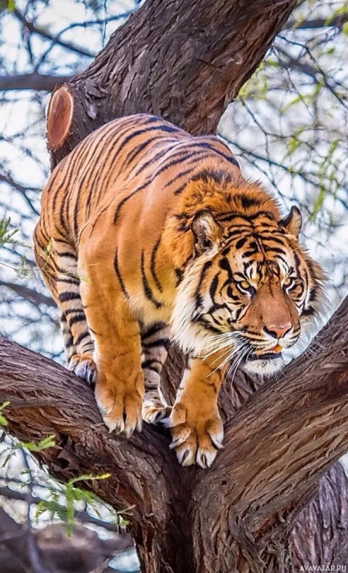 Картинка показывает тигра в его естественной среде обитания, поднимающегося по ветвям дерева. Тигр, по-видимому, сосредоточен на чем-то в верхней или боковой части дерева, возможно, добыче или объекте интереса. Это динамичная сцена, отражающая ловкость и силу этих величественных животных.