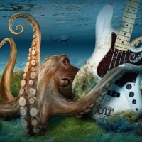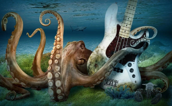 an underwater scene with two octopuses and a guitar. One of the octopuses is in the foreground, while the other one is slightly behind it to the left. They are surrounded by various