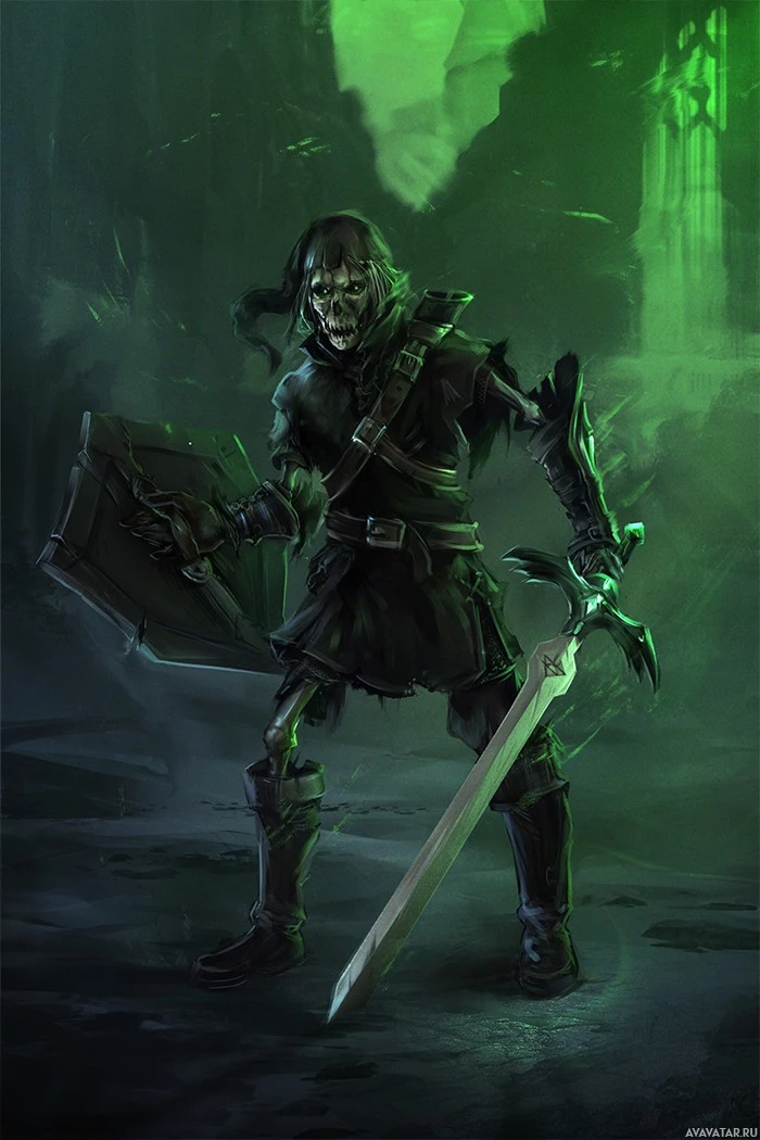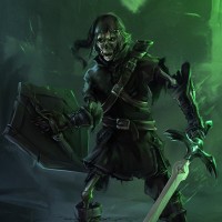 game series. He is standing in a gothic or eerie setting, with ominous green lighting and