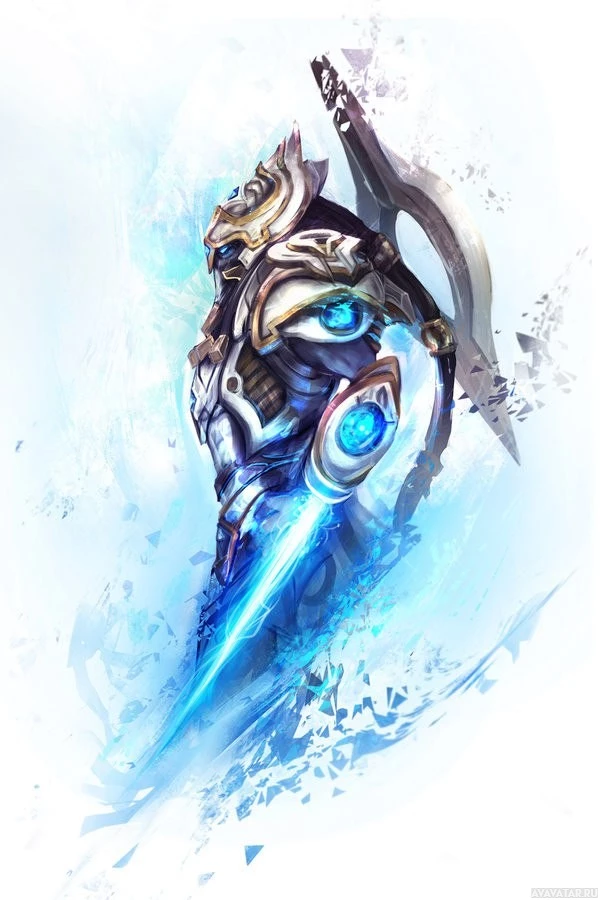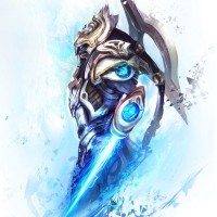 Starcraft series, as indicated by the style of the armor and the overall aesthetic. The background has a dynamic and somewhat fantastical appearance, with what seems to be water or