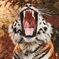 На снимке изображен тигр с открытой ревущей пастью. Судя по всему, он находится в естественной обстановке, возможно, в дикой природе или в вольере, спроектированном так, чтобы напоминать их естественную среду обитания.