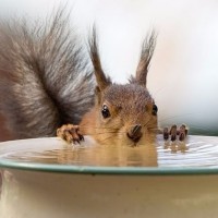 The image shows a squirrel with its front paws dipped into a small pool or container of water. The squirrel appears to be drinking the water, as it holds its paws just above the surface of the liquid. The squirrel is focused on its activity and seems to be enjoying its time in the water.