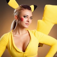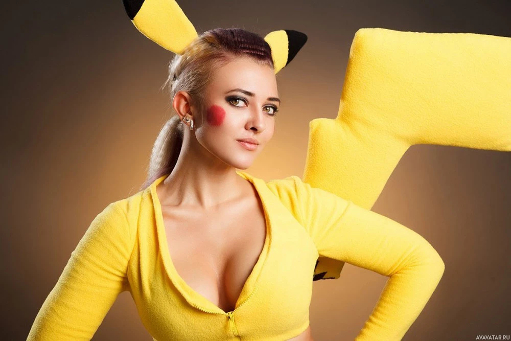 Pikachu costume from the Pokémon franchise. She is posing for the camera with one hand on her hip and the other holding up her chest to display the costume's design, which includes