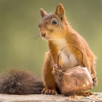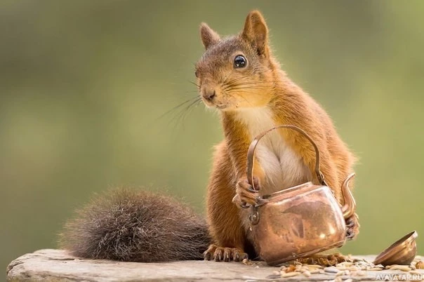 The image shows a squirrel holding what appears to be a small,