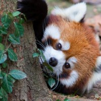 a red panda, which is a small mammal with reddish-brown fur. It appears to be climbing or playing on