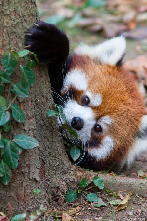 the trunk of a tree, with one hand gripping onto the bark while its nose is close to some leaves, possibly eating or exploring them. The red panda has a white face and
