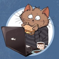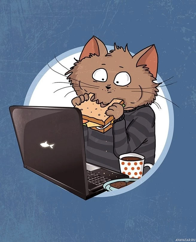 a cartoon cat sitting in front of an open laptop computer. The cat appears to be multitasking by eating a sandwich and drinking from a mug simultaneously, possibly as if it's working or browsing the internet. This humorous depiction plays on