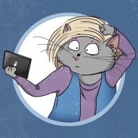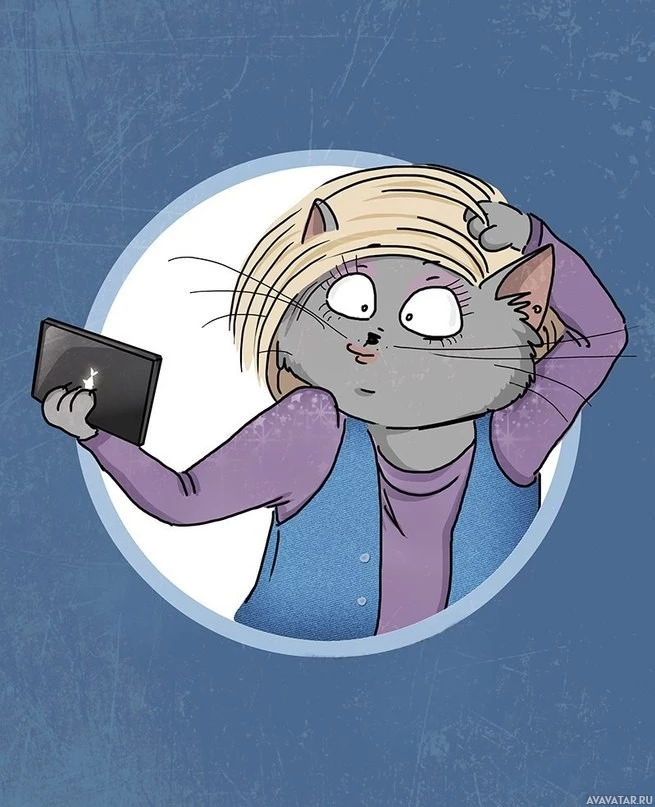 На картинке изображена иллюстрированная кошка с человеческими чертами, сидящая за столом и глядящая на собственное отражение в зеркале. Он держит смартфон, как будто делает селфи. У кошки удивительное или запутанное выражение лица.