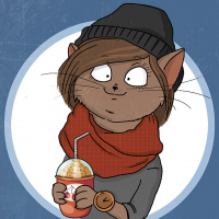 cat character wearing a beanie and scarf. This character is depicted sitting down, looking surprised or shocked. In the cat's hands are what appears to be a straw from a drink, specifically a soda or