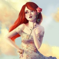 a floral dress and holding a single rose to her nose as if smelling it. Her gaze is directed off to the side, and she has