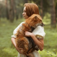 На картине изображена молодая женщина с рыжими волосами. Она держит лису на руках, которая имеет смесь коричневого и белого меха. Они стоят на открытом воздухе в лесу или лесистой местности, учитывая наличие деревьев вокруг них. Девушка и лиса, кажется, разделяют нежное взаимодействие.