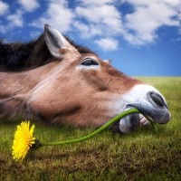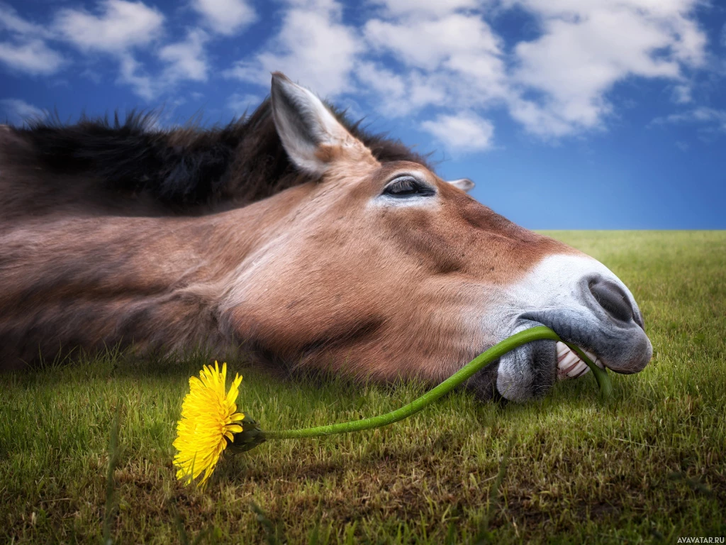 a yellow dandelion, which has not yet flowered, near the donkey's mouth as if it were grazing or about to do so. The sky in the background is blue and clear, suggesting
