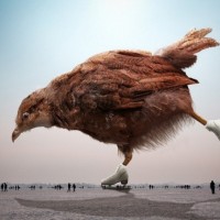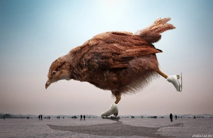 The image shows a bird, specifically an ostrich, with human-like skis attached to its feet. It appears as though the ostrich is running on the ice or frozen surface of