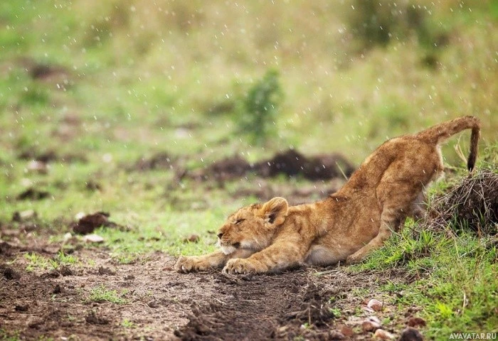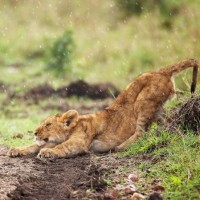a young lion, perhaps practicing its muscles or engaging in play behavior. The setting looks like