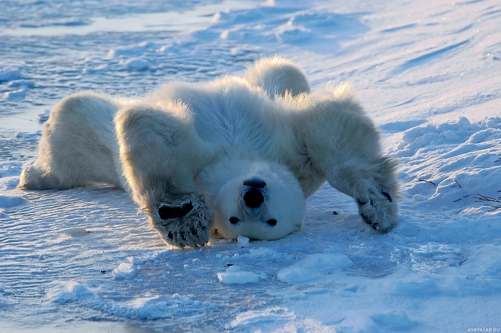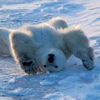 a polar bear on its side, lying down in the snow. It appears to be rolling onto its back with one leg extended upward, which is a common playful behavior observed in young