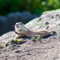 The image shows a gopher resting on some dirt. It appears to be in the wild, possibly on a rocky surface or a mound of soil. There are small plants and greenery around, suggesting it might be in a natural habitat or an area with some vegetation.
