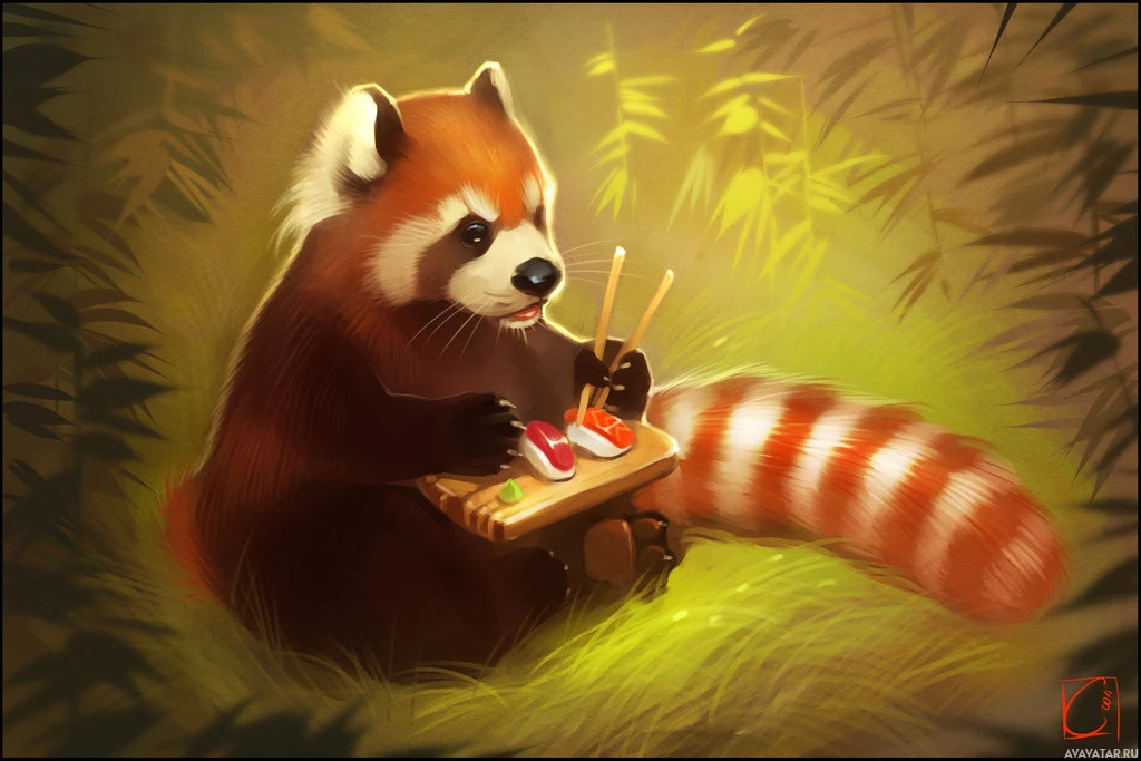a red panda sitting on the ground, holding what appears to be a pair of chopsticks over a piece of food that could be part of a meal or some other kind of snack. The background features green foliage that suggests