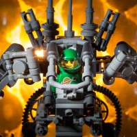 mechanical parts and connections. Inside the suit, there is a small figure of a person wearing green and red attire, which might be