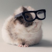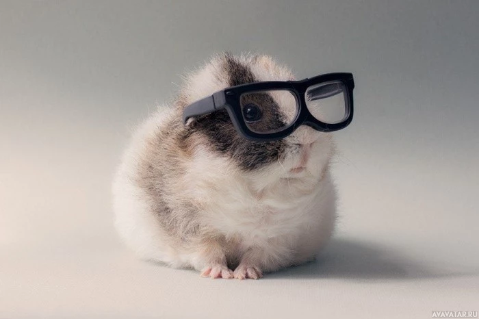 In the picture, there is a guinea pig wearing a pair of black glasses. The animal appears to be sitting still and looking directly at the camera, giving a humorous and somewhat human-like impression due to the accessory it's wearing.