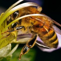 The picture shows a bee, which is an insect. It appears to be a close-up view of the bee interacting with a plant, possibly feeding or gathering nectar from it. The bee's wings are visible and appear to be in motion or ready for flight.