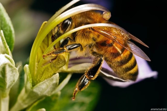 На картинке изображена пчела, которая является насекомым. По-видимому, это вид пчелы, взаимодействующей с растением, возможно, кормящей или собирающей нектар. Крылья пчелы видны и, кажется, находятся в движении или готовы к полету.